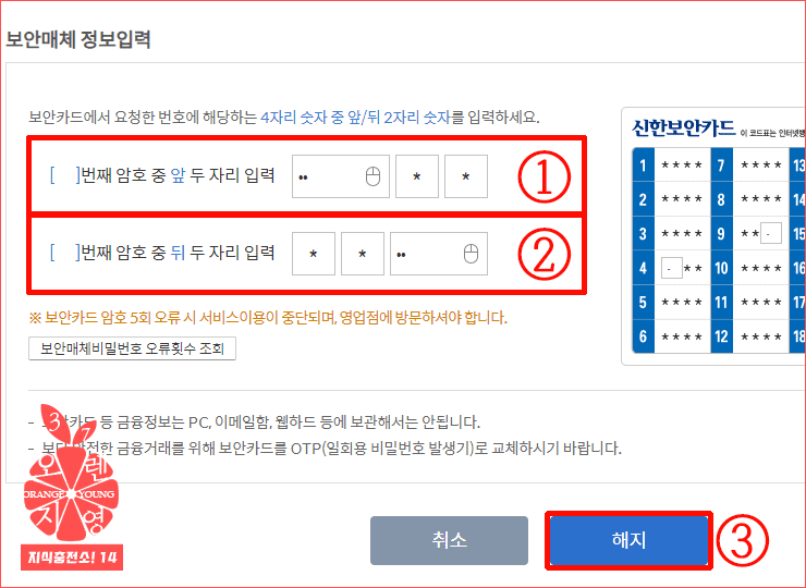 ① 신한은행 보안카드에서 [요청한 번호]에 해당하는 4자리 숫자 중 '앞 2자리 숫자'를 입력하세요.