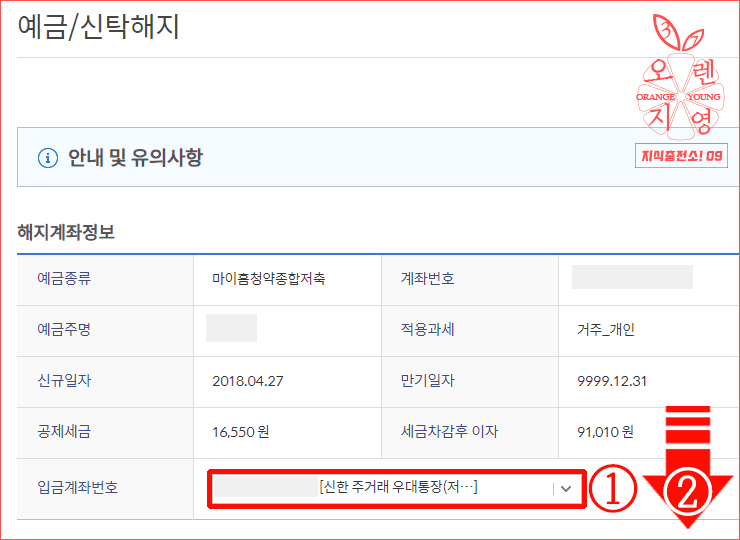 ① 예금/신탁해지와 관련한 [안내 및 유의사항]을 확인합니다.