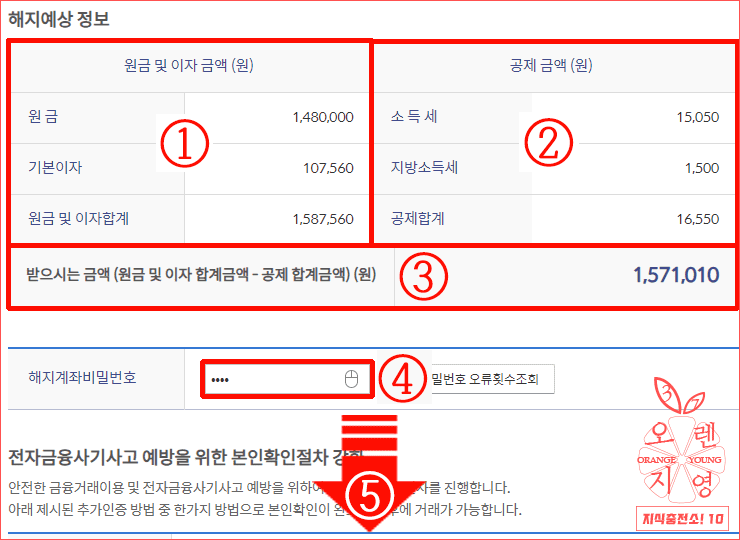 ⇨ 1,587,560원(원금 및 이자 금액) - 16,550원(공제 금액) = 1,571,010원을 입금되는 것입니다.
