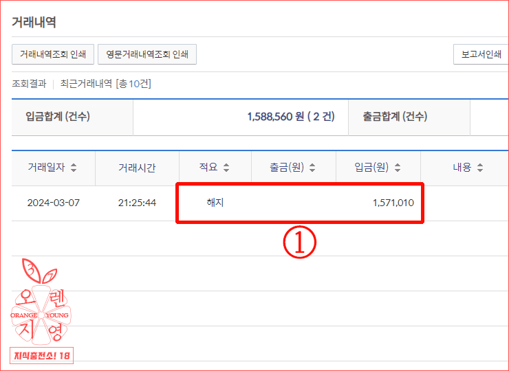 적요에는 [해지]라고 기재되어 있으며, [입금금액 1,571,010원]이 정확히 입금되었습니다.