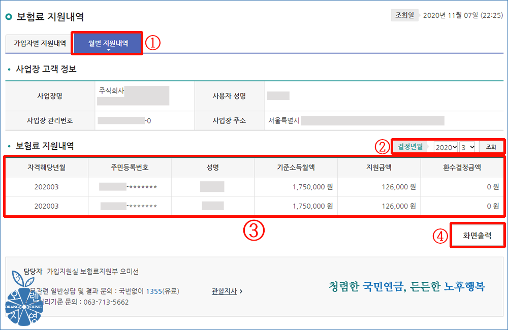 ③ 위와 같이 가입자별로 보험료 지원내역이 조회됩니다.