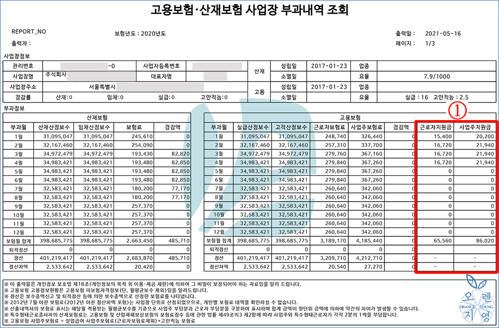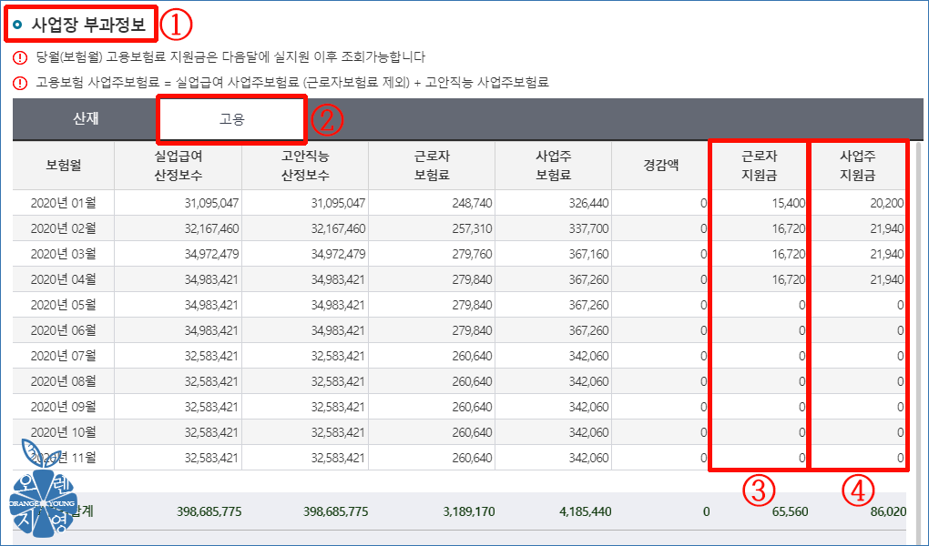 ① 산재보험과 고용보험 산정보수, 보험료와 더불어 근로자지원금과 사업주지원금을 확인하실 수 있습니다.