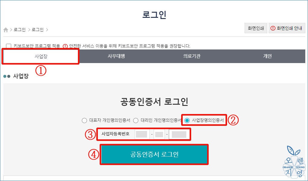 ※ 개인사업자라면 대표자 개인명의인증서에 ○ 체크(✓)하여 로그인하세요.