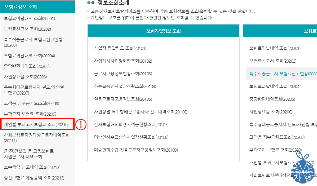 ① '개인별 부과고지보험료 조회(20210)'을 클릭합니다.