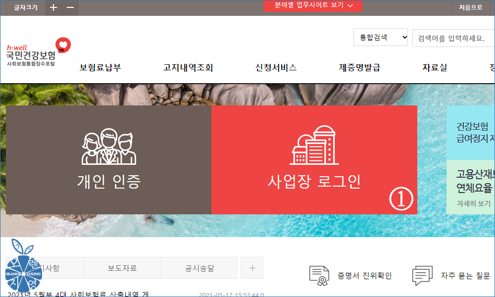 ① 건강보험 납부내역조회를 하기 위해 '사업장 로그인' 버튼을 클릭합니다.