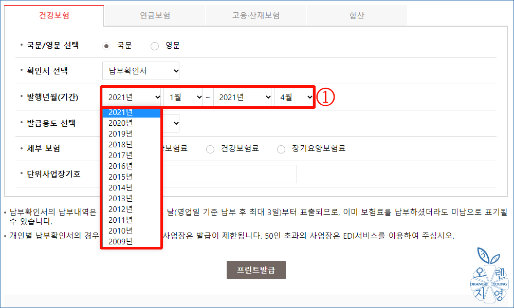 ① 발행년월(기간)* : 건강보험료 납부조회할 발급 연도와 월을 선택합니다.