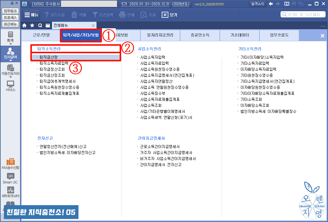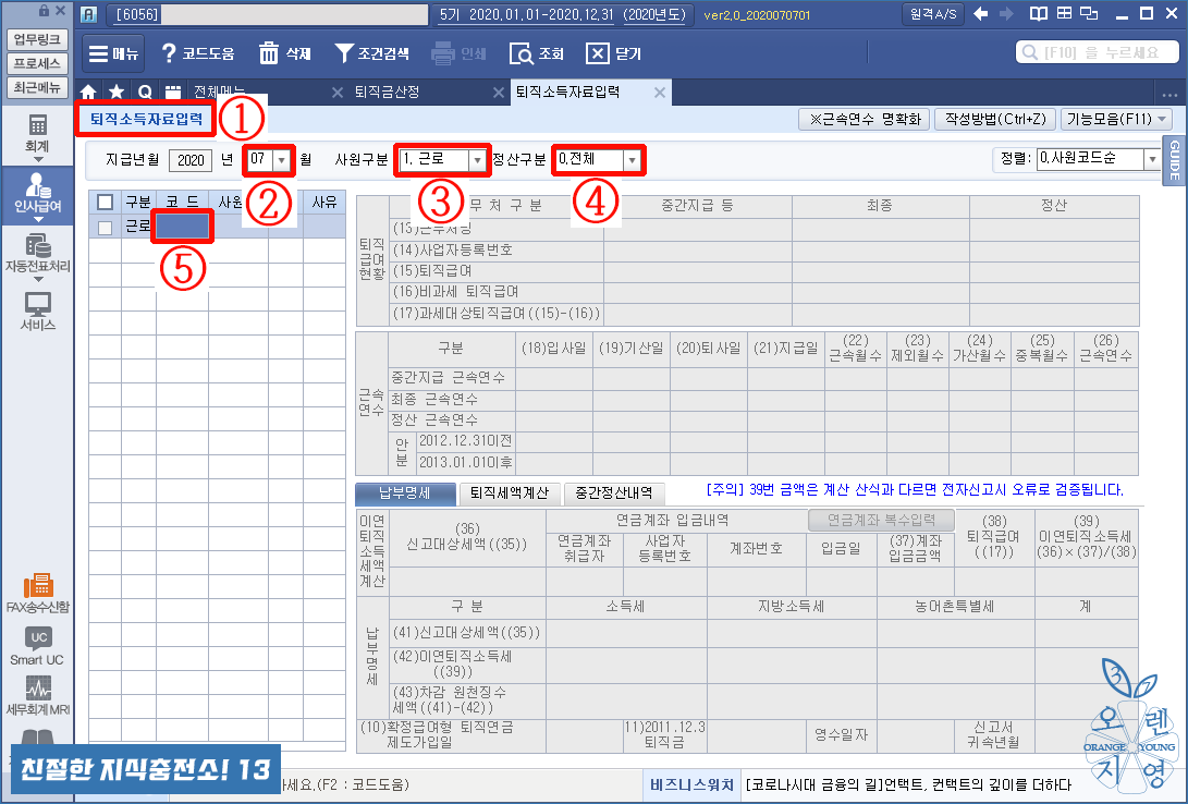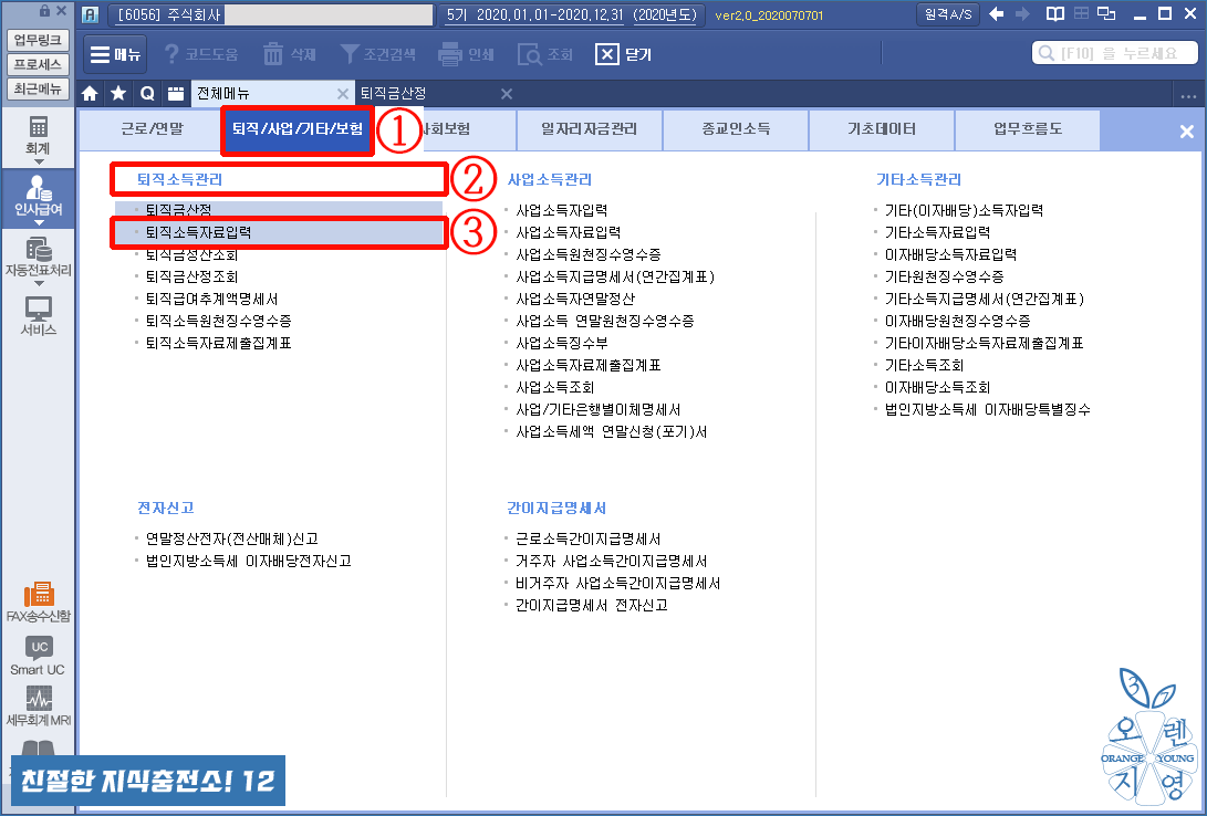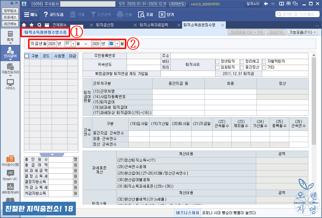 ① [퇴직소득자료입력] 메뉴입니다.