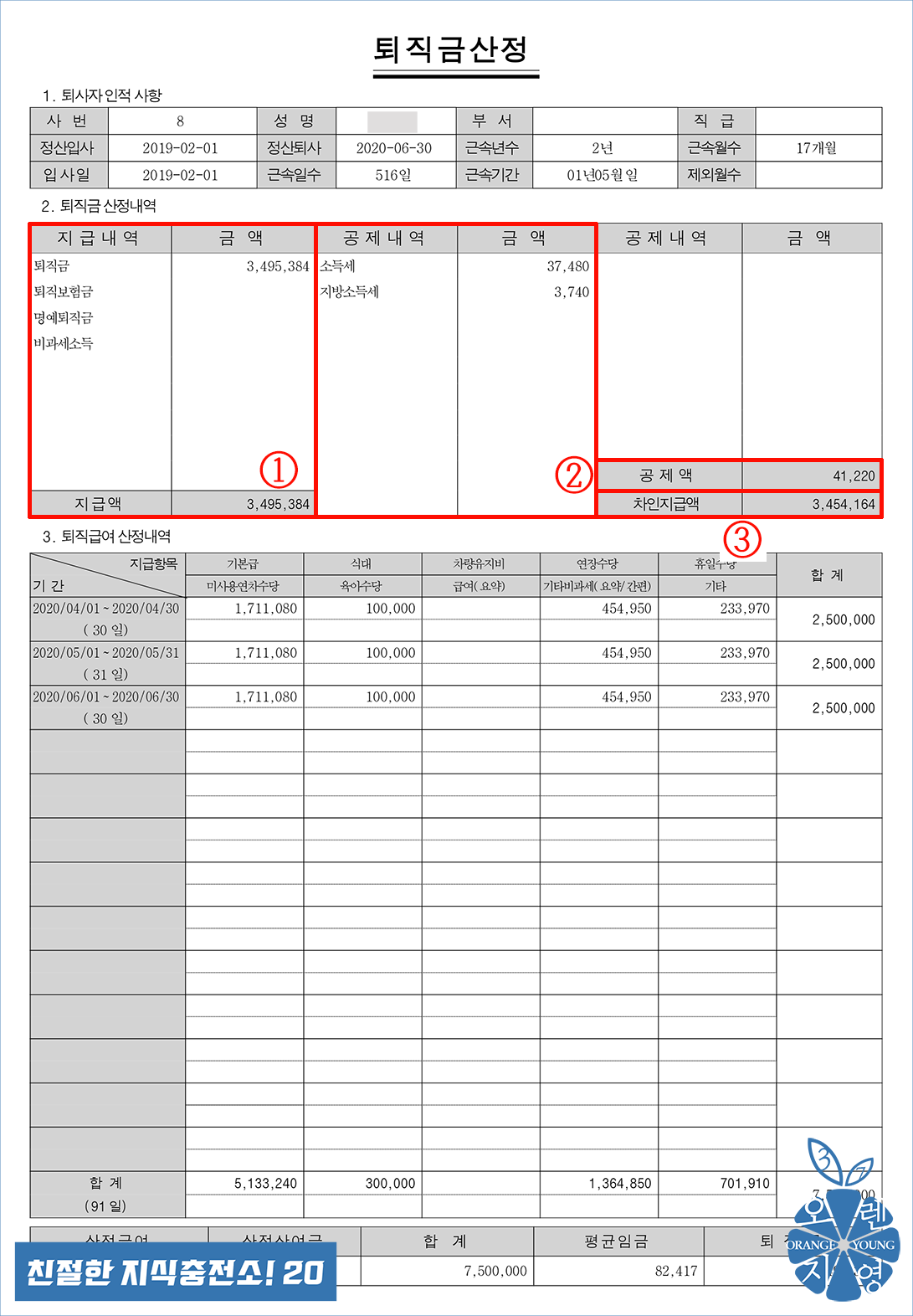 ① 퇴직정산내역 : 퇴직금 정산방법과 퇴직금 산정내역서를 보여줍니다.