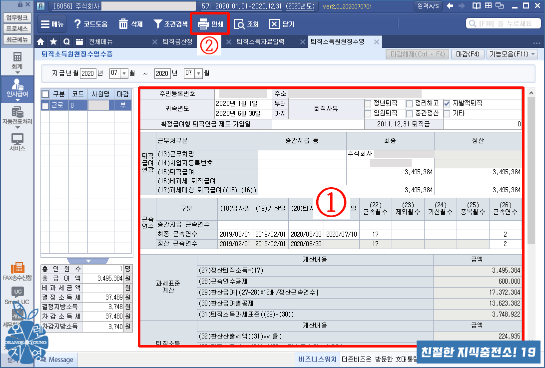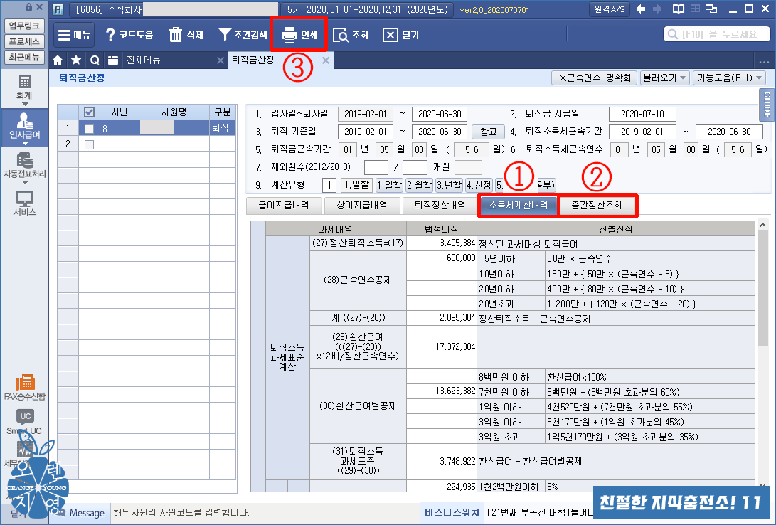 ① 소득세계산내역 : 퇴직소득세계산내역을 보여줍니다.